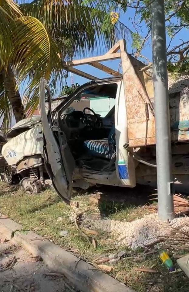 Una falla en el sistema de dirección habría causado que una camioneta volquete se impactara contra árboles en el fraccionamiento Caribe; el conductor resultó lesionado y el vehículo terminó destrozado