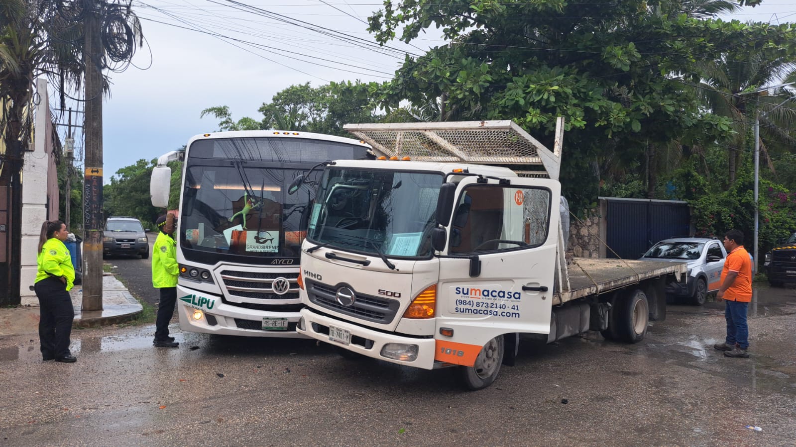 TULUM a 07 de octubre .— Un accidente de tránsito ocurrido esta mañana en la intersección de las calles Cobá y Palenque, en la cabecera municipal, volvió a evidenciar el riesgo que representa la falta de señalización en ese punto. Un autobús de transporte de personal del hotel Grand Sirenis chocó contra un camión de carga, dejando como saldo una persona lesionada y el cierre temporal de la vialidad.