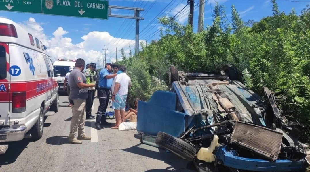 Tulum, 14 de septiembre.- Un accidente ocurrido en la carretera federal 307, a la altura de Chemuyil, dejó a cuatro integrantes de una familia lesionados y su vehículo en pérdida total.