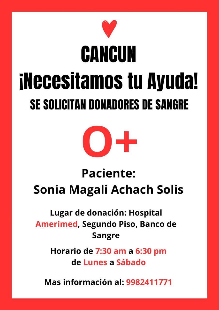 Cancún, Q. Roo.– La familia de la exalcaldesa de Cancún, Sonia Magali Achach Solís, realizó un llamado urgente a la ciudadanía para apoyar con donaciones de sangre tipo O+, debido a la delicada situación de salud que enfrenta.