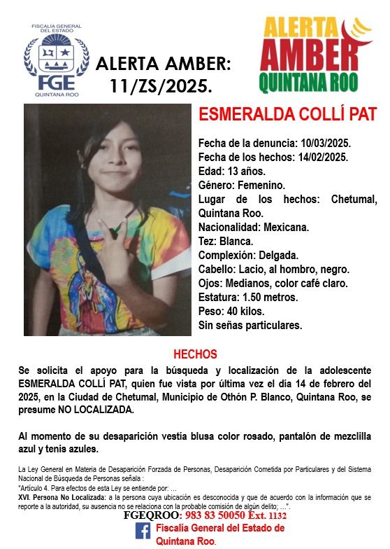 CHETUMAL, 11 de marzo.- A casi un mes de su desaparición, familiares de Esmeralda Colli Pat, de 13 años de edad, solicitaron la intervención de la Fiscalía General del Estado para activar la ficha de búsqueda. La menor fue vista por última vez el 14 de febrero de 2025 en la ciudad de Chetumal, según la Alerta Amber 11Z 2025. Su desaparición fue reportada oficialmente el 10 de marzo, casi un mes después.