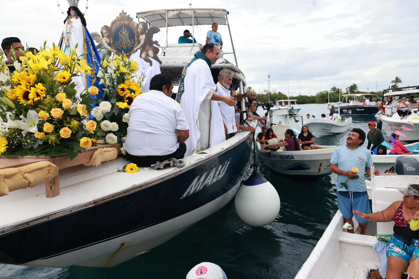 La jornada inició con la tradicional procesión por las calles del Centro, donde familias isleñas y visitantes caminaron entre cantos y oraciones rumbo al muelle fiscal. Desde ese punto, numerosas embarcaciones zarparon en caravana para acompañar a la imagen de la Virgen en un recorrido marítimo en el que participaron familias de todas las edades.