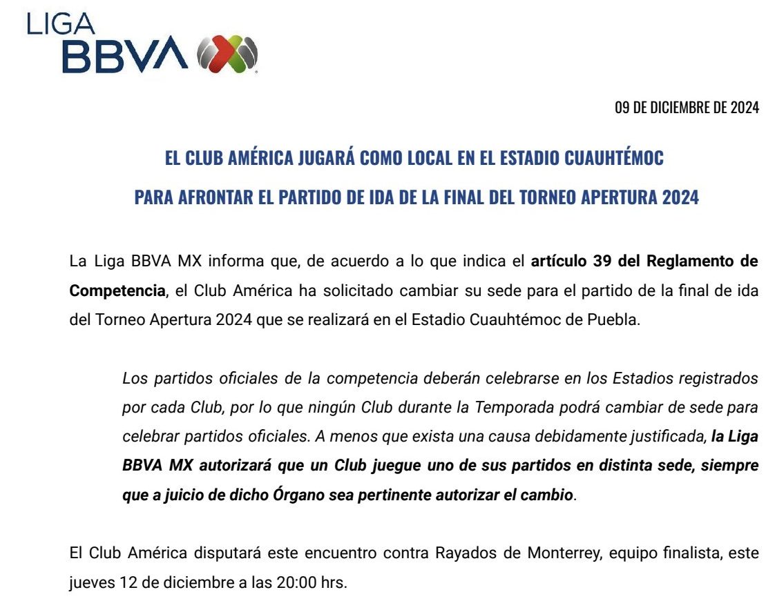 • La Liga MX confirmó el cambio de sede para la localía del América en la final ante Monterrey, a disputarse el próximo jueves a las 8:00 p.m.