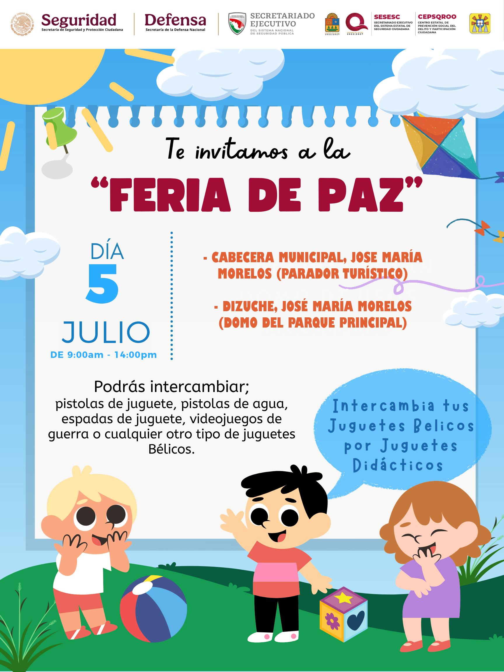 Uno de los ejes principales de esta feria es el canje de juguetes bélicos —como pistolas de juguete, espadas y videojuegos de guerra— por materiales didácticos y lúdicos. Esta acción busca sembrar en niñas, niños y adolescentes una conciencia temprana sobre la importancia del juego no violento y su impacto en la formación de valores. Las sedes del evento serán el parador turístico de la cabecera municipal y el domo del parque principal de la comunidad de Dziuche, ambos con horario de atención de 9:00 a 14:00 horas.