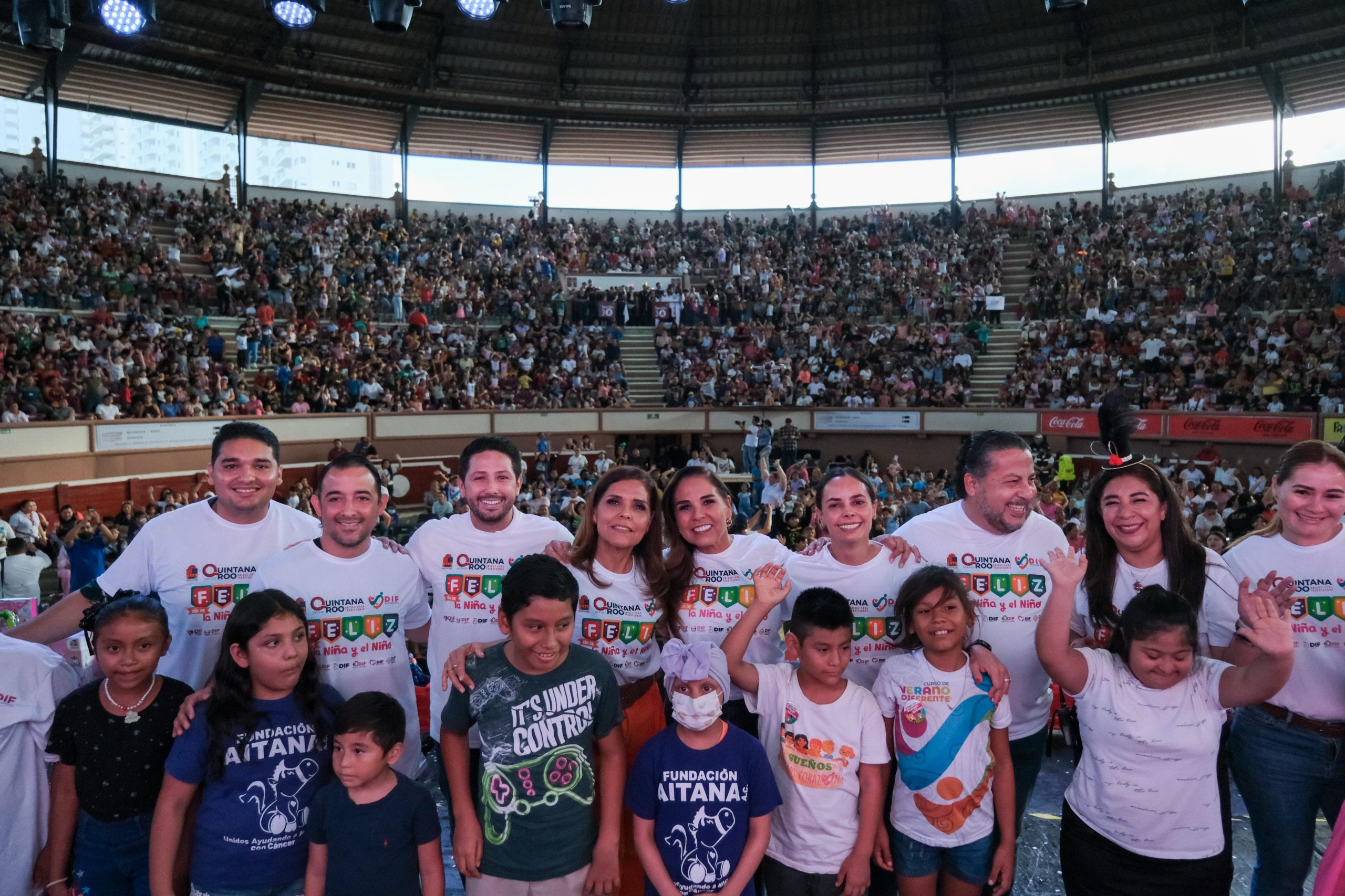 Cancún.- La gobernadora Mara Lezama Espinosa, junto a la presidenta honoraria del Sistema DIF Quintana Roo, Verónica Lezama Espinosa, y la presidenta municipal, Ana Paty Peralta, celebraron a la niñez acompañados de sus familias el “Día de la Niña y el Niño”, en la Plaza de Toros de esta ciudad.