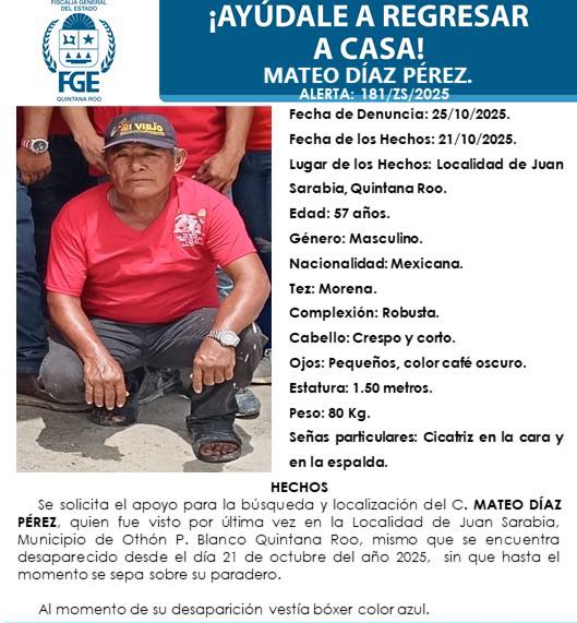 La Fiscalía de Quintana Roo busca a Mateo Pérez Díaz, de 57 años, desaparecido desde el 21 de octubre en Juan Sarabia. Se pide apoyo ciudadano para su localización