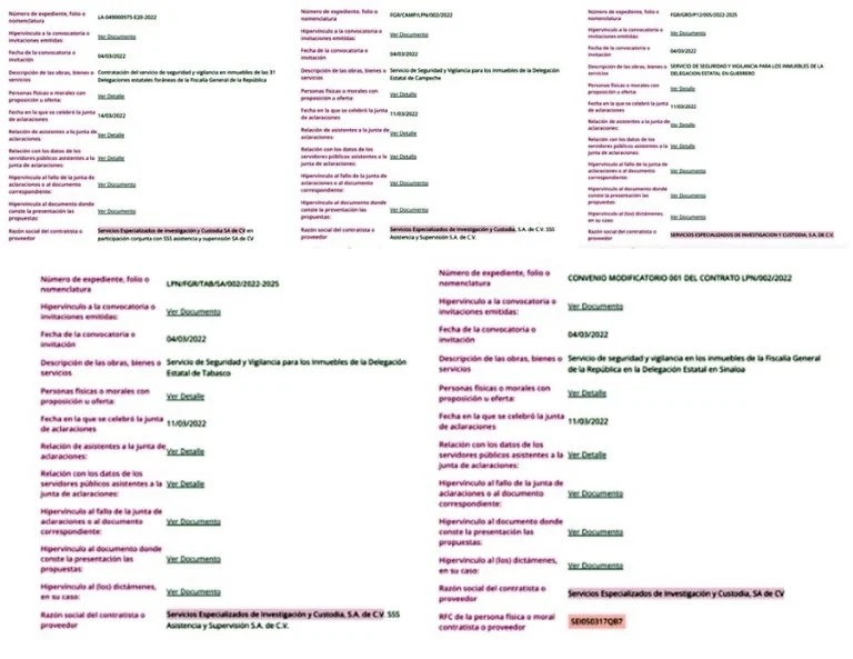 De acuerdo con un análisis de Mexicanos Contra la Corrupción y la Impunidad, con base en la información disponible en el portal de ComprasMx de la Secretaría de Anticorrupción y Buen Gobierno (antes Compranet) y datos obtenidos de la Plataforma Nacional de Transparencia (PNT), la compañía Servicios Especializados de Investigación y Custodia, S.A. de C.V. (SEICSA) recibió entre 2020 y 2022 al menos 30 contratos por parte de la FGR por más de 300 millones de pesos para el resguardo de sus inmuebles.