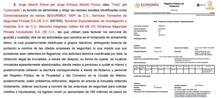 En la acusación de la FGR se menciona a Jorge Enrique Alberts Ponce como administrador de las empresas de seguridad utilizadas para traficar armas. En un acta mercantil de SEICSA consta que su nombramiento como apoderado se otorgó desde 2017.