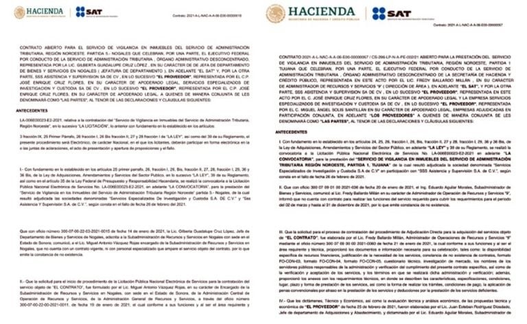 Contratos que el SAT asignó a SEICSA para custodiar las aduanas de Tijuana y Nogales, dos de los puntos que han sido conflictivos en el contrabando de combustible.