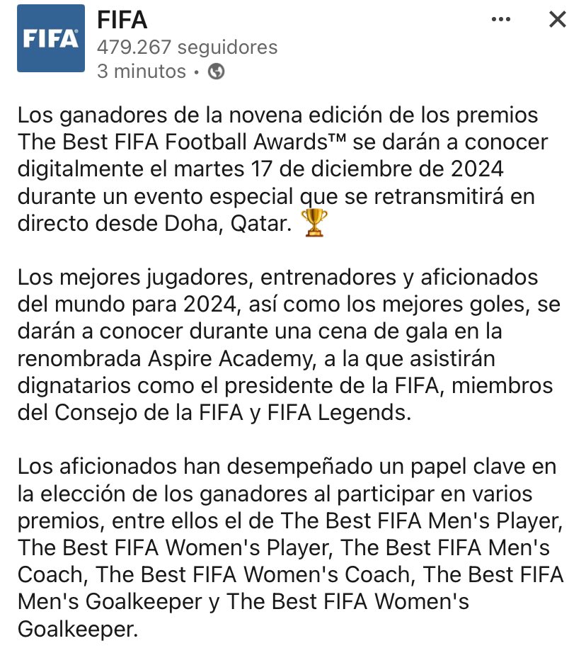 En la cita, se conocerán los ganadores de los premios The Best a los mejores jugadores y jugadoras, entrenadores y entrenadoras, goles y aficionados de 2024, recalca FIFA en un comunicado.