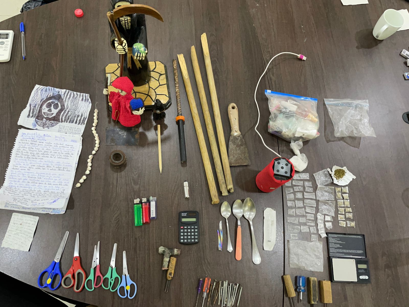 Durante el operativo se decomisaron 13 envoltorios con marihuana, ocho con presunto cristal y 27 bolsas con parafernalia, además de herramientas y artículos no permitidos como 17 clavos, nueve objetos cortantes, cinco tijeras, cuatro armas punzocortantes, tres encendedores, cucharas, imágenes religiosas y altares dedicados a la Santa Muerte.