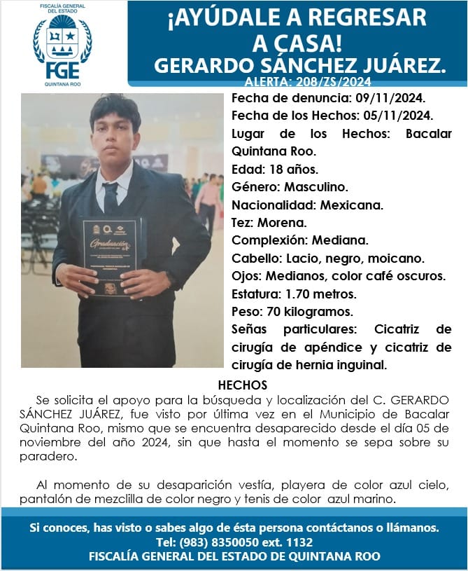 La Fiscalía General del Estado de Quintana Roo emitió una ficha de búsqueda para localizar a Gerardo Sánchez Juárez, de 18 años, desaparecido desde el 5 de noviembre en Bacalar