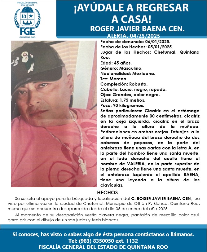 CHETUMAL, 7 de enero.- La Fiscalía General del Estado de Quintana Roo emitió una ficha de búsqueda para localizar a Roger Javier Baena Cen, quien fue privado de su libertad el pasado 5 de enero en la colonia Polígono 2 de esta ciudad.