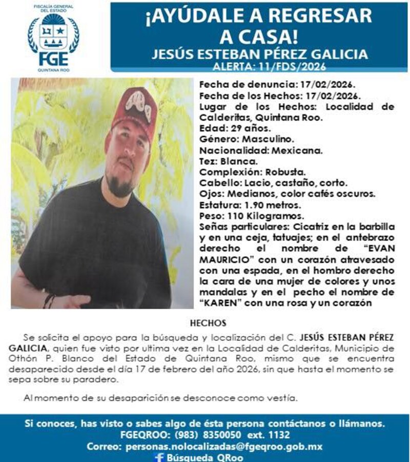 Chetumal, 17 de febrero.- La Fiscalía General del Estado de Quintana Roo emitió una ficha de búsqueda para localizar a Jesús Esteban Pérez Galicia, un hombre de 29 años de edad cuyo paradero se desconoce desde el pasado 17 de febrero de 2026, cuando fue visto por última vez en la localidad de Calderitas, perteneciente al municipio de Othón P. Blanco. Las autoridades ministeriales hicieron un llamado a la ciudadanía para colaborar con cualquier información que contribuya a su localización.