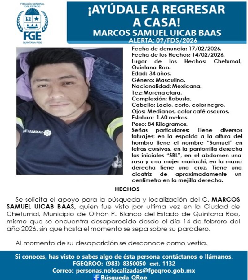 Chetumal, 19 de febrero.- La Fiscalía General del Estado de Quintana Roo emitió una ficha de búsqueda para dar con el paradero de Marcos Samuel Uicab Baas, un hombre de 34 años cuyo paradero se desconoce desde el pasado 14 de febrero de 2026 en la ciudad de Chetumal, municipio de Othón P. Blanco. Las autoridades ministeriales solicitaron el apoyo de la ciudadanía para aportar información que contribuya a su pronta localización.