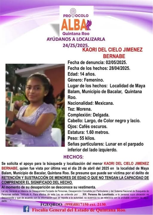 Chetumal, 6 de mayo.- La Fiscalía General del Estado de Quintana Roo emitió una ficha de búsqueda para localizar a Kaori del Cielo Jiménez Bernabé, una adolescente de 14 años que fue vista por última vez el pasado 28 de abril en la localidad de Maya Balam, municipio de Bacalar. Desde esa fecha, sus familiares desconocen su paradero.