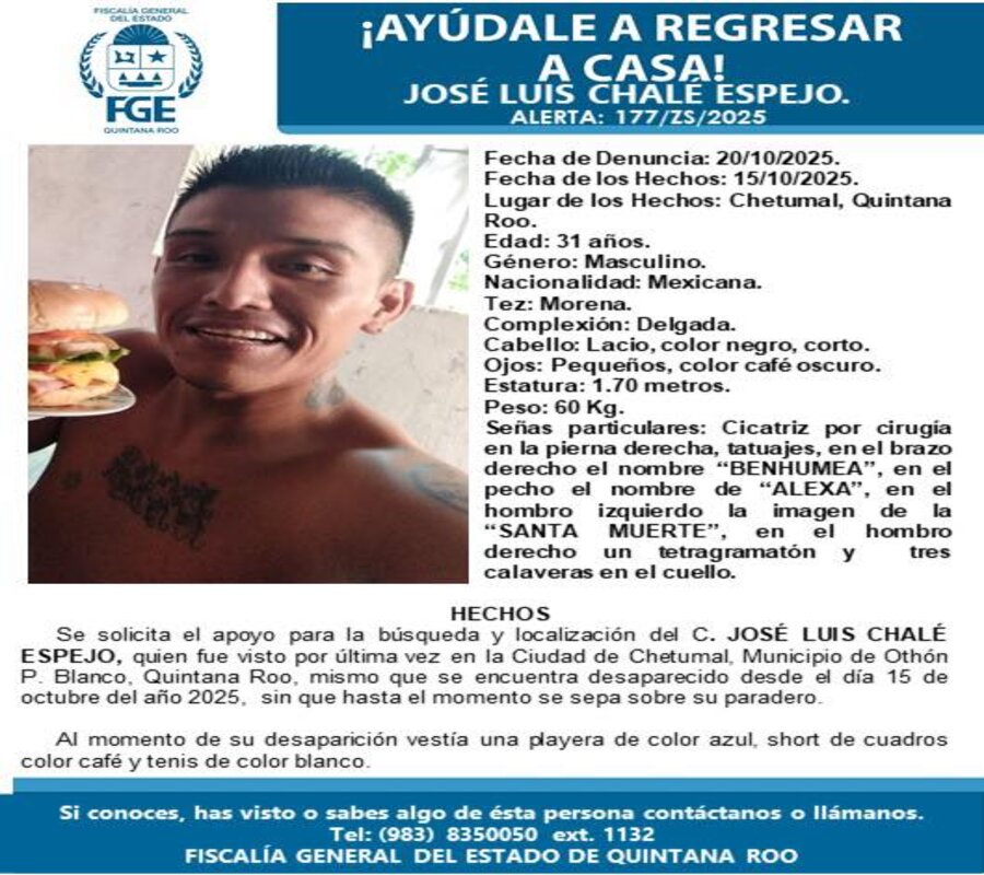 Chetumal, 21 de octubre.- La Fiscalía General del Estado de Quintana Roo emitió una ficha de búsqueda para localizar a José Luis Chale Espejo, un hombre de 31 años desaparecido desde el pasado 15 de octubre en Chetumal.