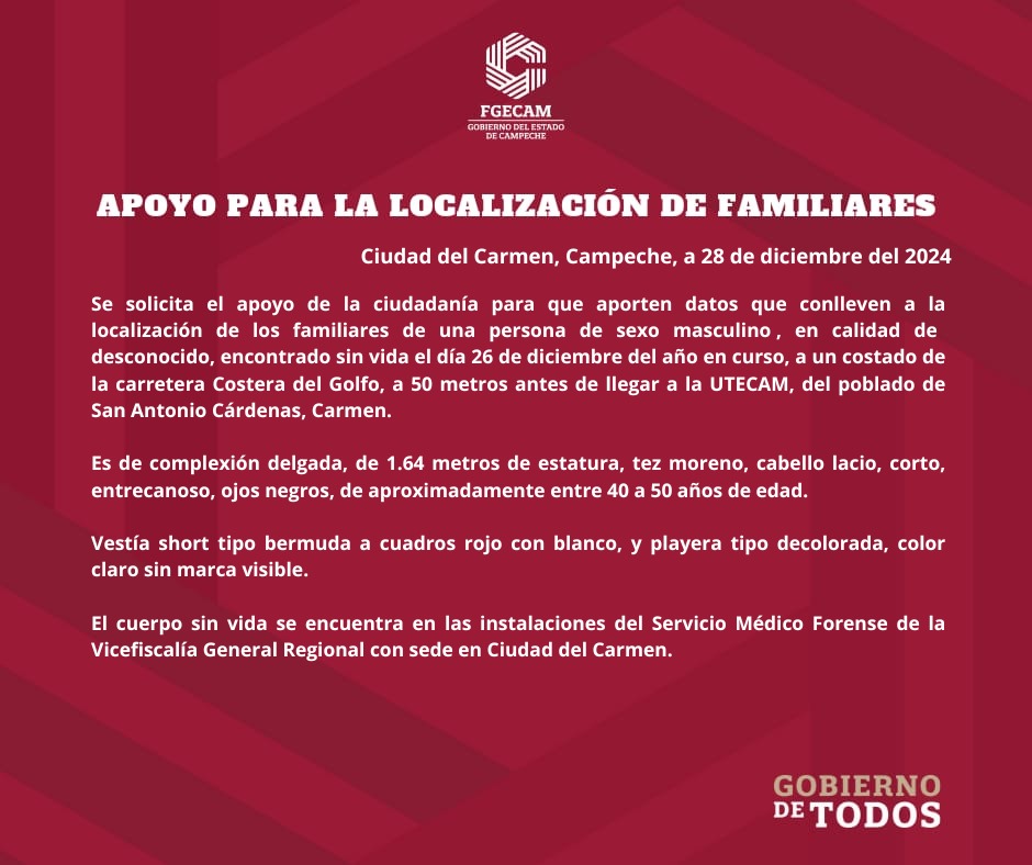 Fue a través de una pleca que la FGECAM pidió la colaboración de la ciudadanía para dar con información que conlleve a la identificación del cuerpo de un hombre que vestía bermuda de cuadros rojo con blanco y una playera decolorada.