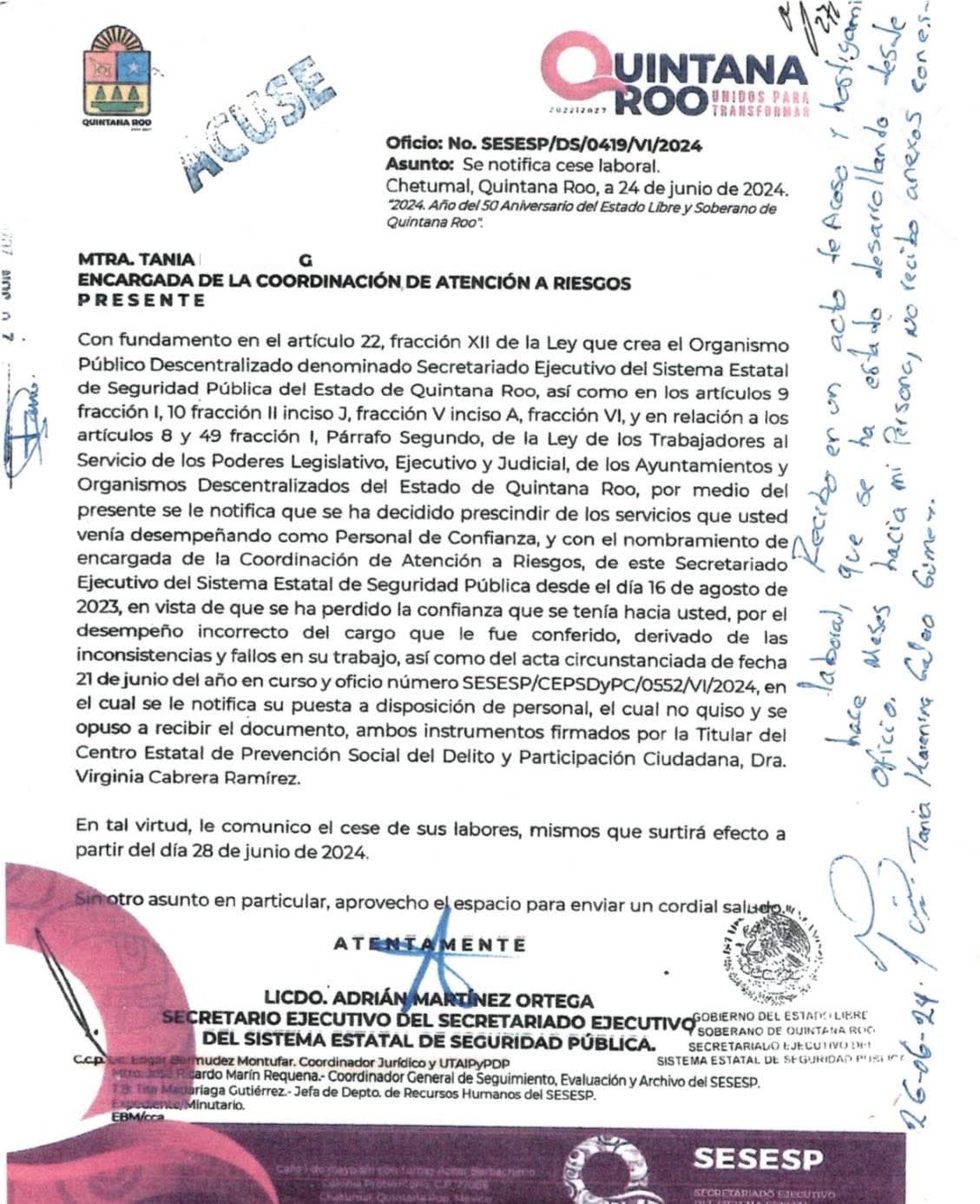 De acuerdo con el expediente, la denuncia fue presentada el 29 de junio de 2024, apenas cinco días después de que la denunciante fuera notificada de su cese como encargada de la Coordinación de Atención a Riesgos, mediante oficio firmado por el titular del SESESP, Adrián Martínez Ortega. Los funcionarios señalados en la querella fueron identificados como J. Ricardo y Virginia C., ambos con cargos directivos en la institución. Durante la investigación, la Fiscalía recabó declaraciones de testigos y personal administrativo, quienes coincidieron en que no hubo conductas inapropiadas ni situaciones de hostigamiento, respaldando la versión institucional del organismo.