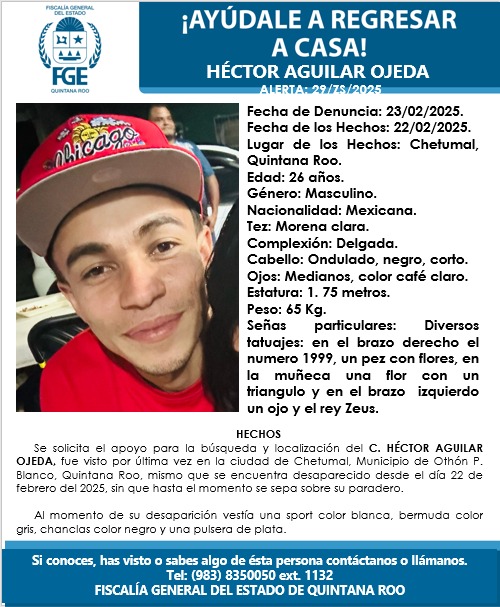 Chetumal, 23 de febrero.- La Fiscalía General del Estado de Quintana Roo activó una ficha de búsqueda para localizar a Héctor Aguilar Ojeda, un joven de 26 años reportado como desaparecido desde el 22 de febrero en la ciudad de Chetumal.