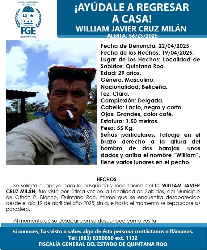 Chetumal, 29 de abril.- La Fiscalía General del Estado de Quintana Roo activó una ficha de búsqueda con el objetivo de localizar a William Javier Cruz Millán, reportado como desaparecido desde el pasado 19 de abril en la comunidad de Sabidos, ubicada en el sur de la entidad. Hasta el momento no se ha obtenido información que permita dar con su paradero.