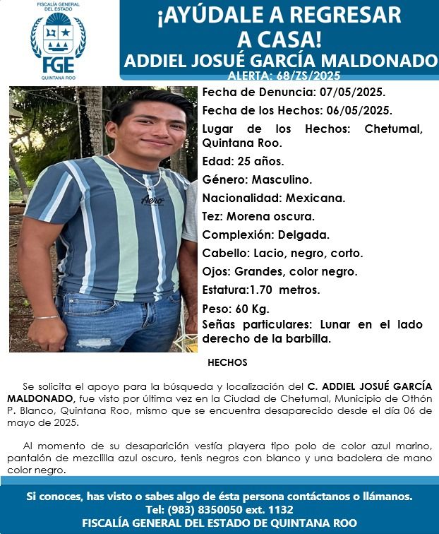 Chetumal, 8 de mayo.- La Fiscalía General del Estado de Quintana Roo activó la ficha de búsqueda 68/ZS/2025 para localizar a Addiel Josué García Maldonado, un hombre de 25 años desaparecido desde el pasado 6 de mayo en la ciudad de Chetumal. Hasta el momento no se cuenta con indicios sobre su paradero tras su ausencia reportada ante las autoridades locales.