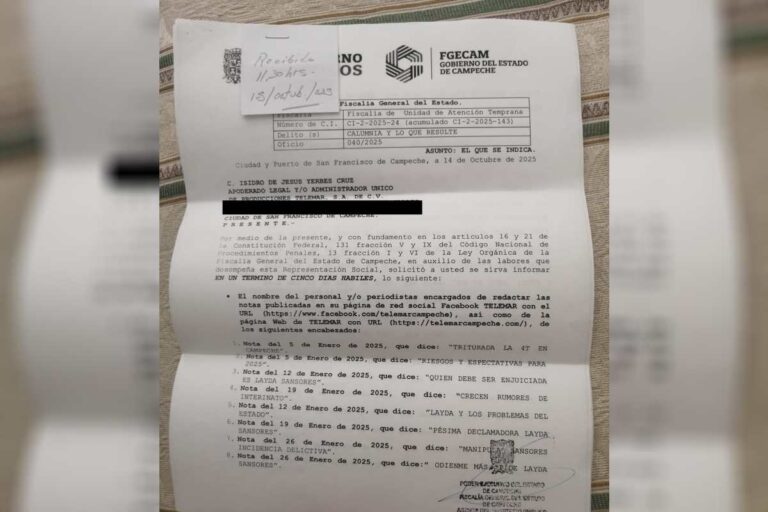 Si bien el documento hace referencia a artículos de la Constitución Federal, el Código Nacional de Procedimientos Penales y la Ley Orgánica de la Fiscalía General del Estado de Campeche, que obligan a personas y empresas a dar información al ministerio público en caso de investigaciones, el uso de estas normas “donde se cuestiona la labor periodística podría constituir un exceso de autoridad”, señala el medio.