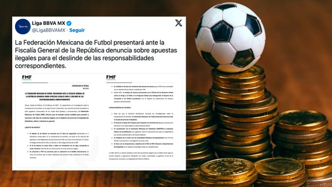 La Federación Mexicana de Futbol presentará ante la Fiscalía General de la República denuncia sobre apuestas ilegales para el deslinde de las responsabilidades correspondientes. pic.twitter.com/tF9owUfZYq