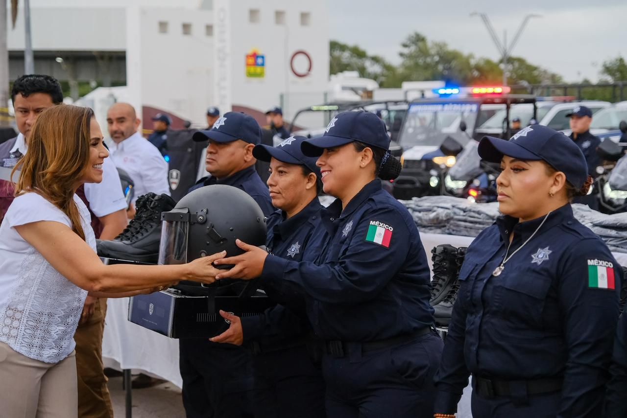 Cozumel.– Con propósito de cuidar la vida, prevenir la violencia y generar confianza, la gobernadora Mara Lezama Espinosa encabezó en Cozumel la renovación y fortalecimiento del parque vehicular, así como la entrega de prendas de protección, vestuario, uniformes, vehículos, mobiliario y equipo tecnológico para la Policía Municipal, como parte de una estrategia integral de construcción de paz con sentido social y transparencia.