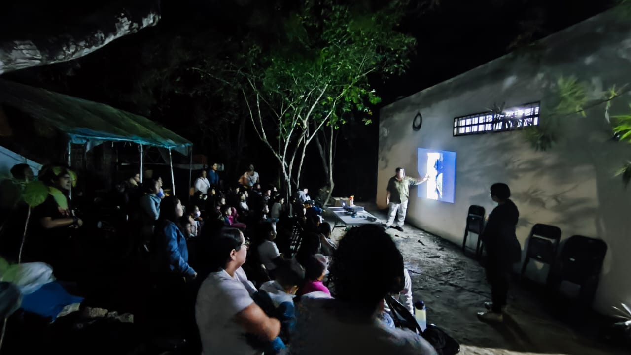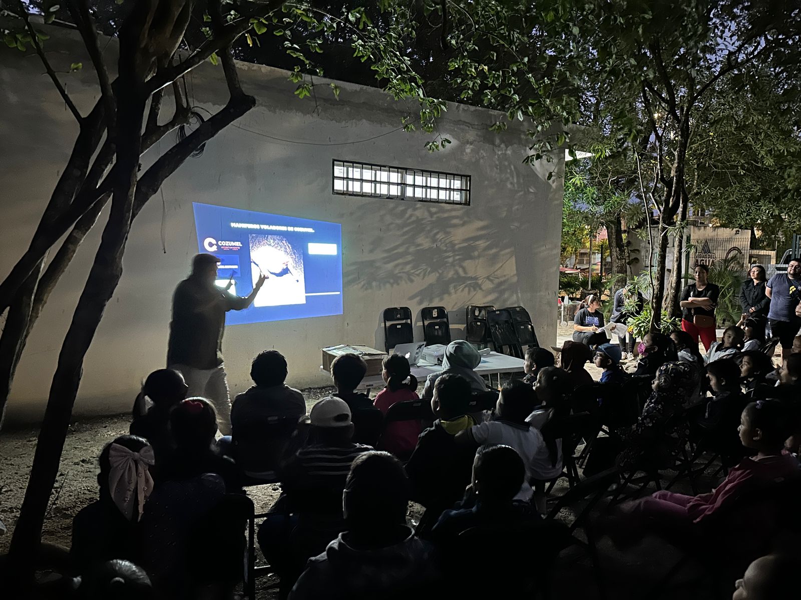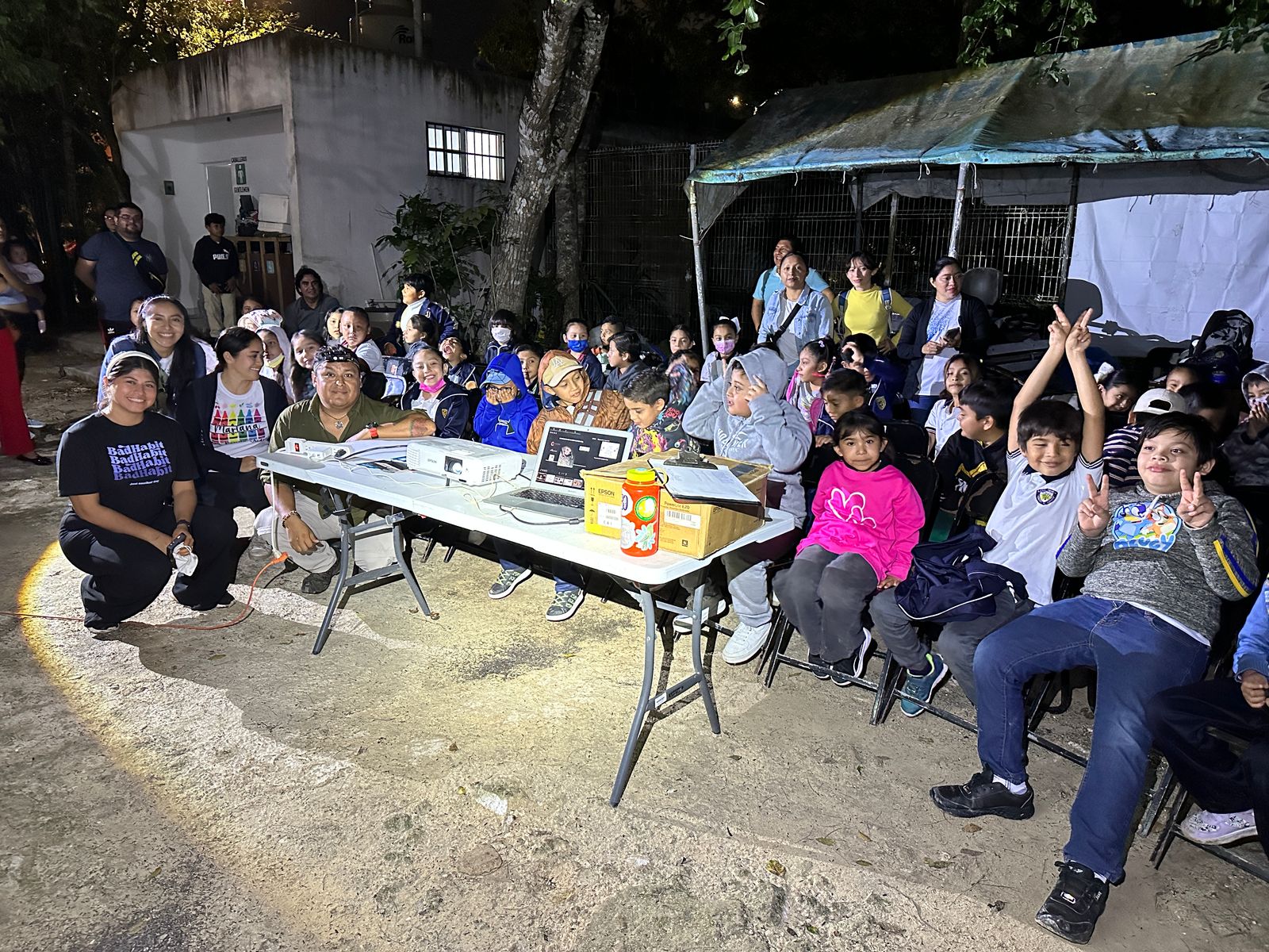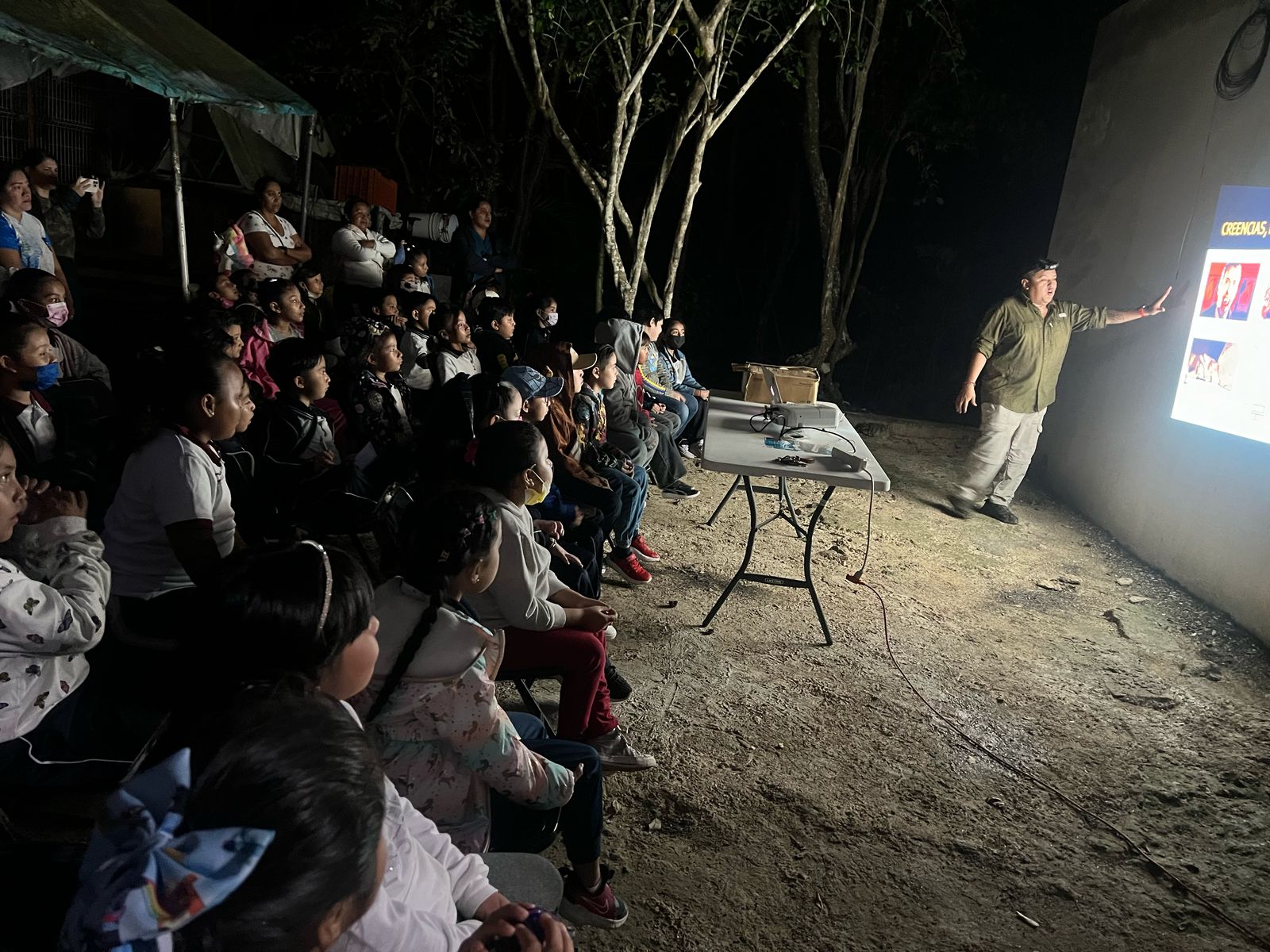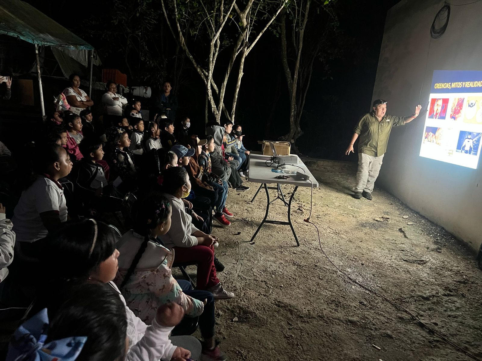 Como parte de estas acciones, se impartió una plática de educación ambiental dirigida a niñas y niños de la comunidad, quienes tuvieron la oportunidad de observar murciélagos antes de ser liberados.