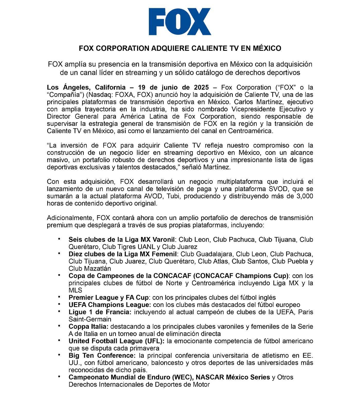 “La inversión de FOX para adquirir Caliente TV refleja nuestro compromiso con la construcción de un negocio líder en streaming deportivo en México, con un alcance masivo, un portafolio robusto de derechos deportivos y una impresionante lista de ligas deportivas exclusivas y talentos destacados”, señaló Carlos Martínez, vicepresidente ejecutivo y director general para América Latina de Fox Corporation.