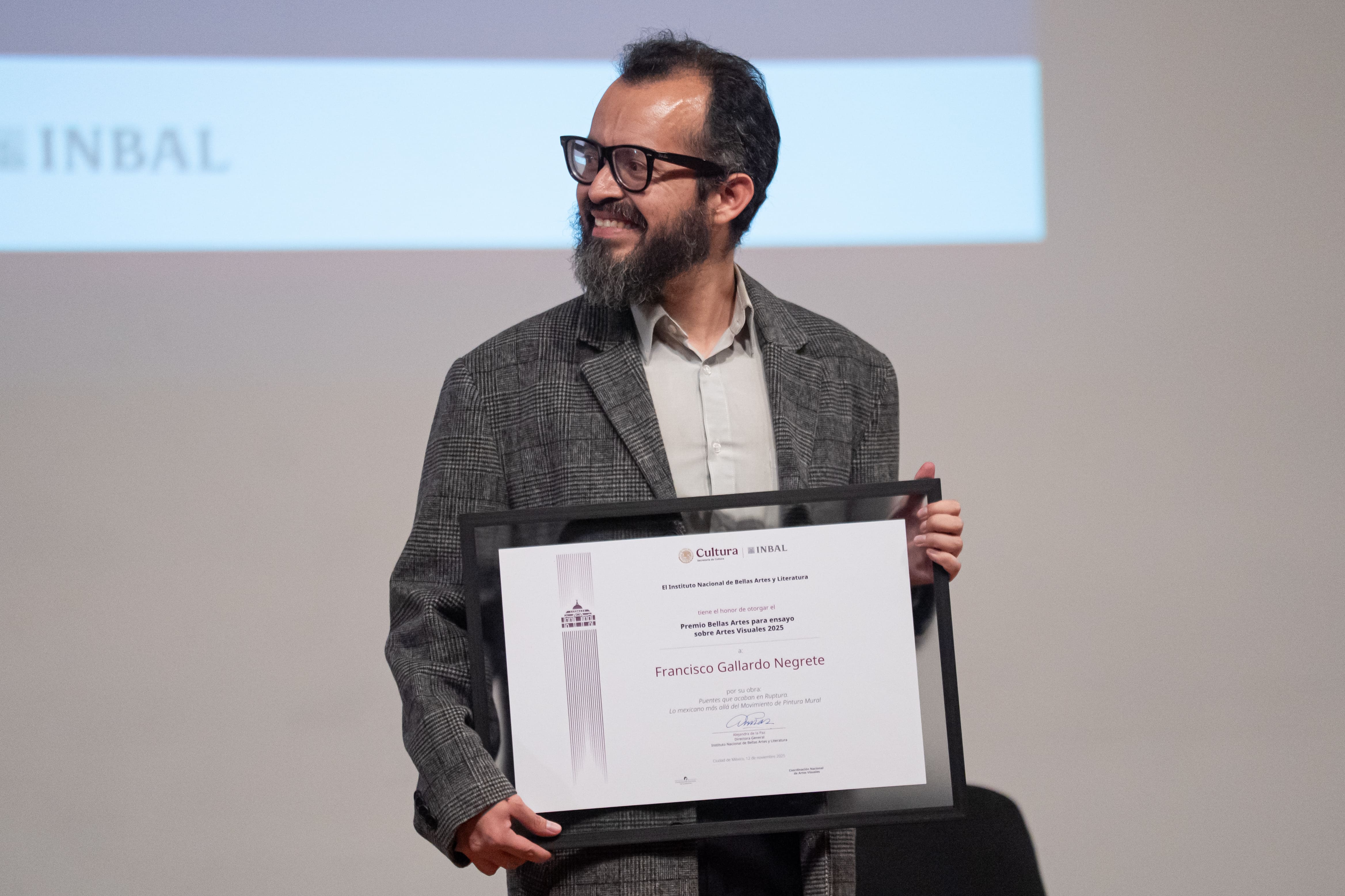La Secretaría de Cultura del Gobierno de México y el Instituto Nacional de Bellas Artes y Literatura (INBAL), a través de las coordinaciones nacionales de Artes Visuales (CNAV) y de Literatura (CNL), otorgaron a Francisco Gallardo Negrete el Premio Bellas Artes para Ensayo sobre Artes Visuales 2025 por su obra Puentes que acaban en ruptura. Lo mexicano más allá del Movimiento de Pintura Mural.
