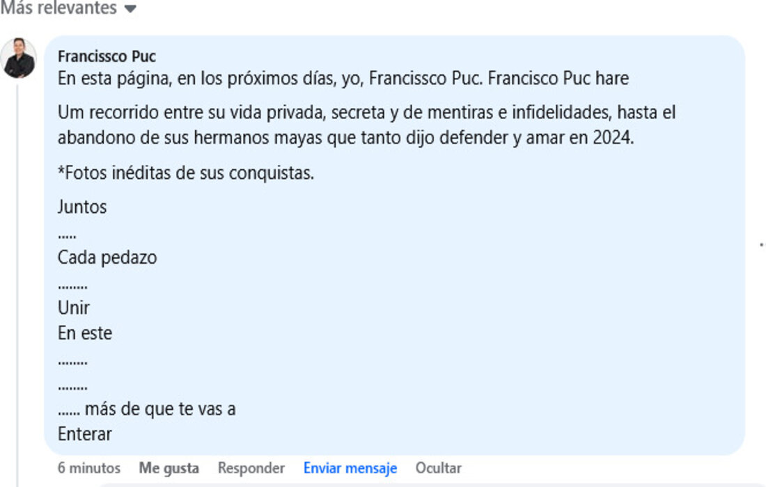 Uno de los mensajes más llamativos publicados en su cuenta hace referencia a un supuesto “recorrido entre su vida privada, secreta y de mentiras e infidelidades”, además de insinuaciones sobre un presunto abandono de sus raíces mayas. El mensaje también incluye una advertencia de futuras publicaciones con “fotos inéditas de sus conquistas”.