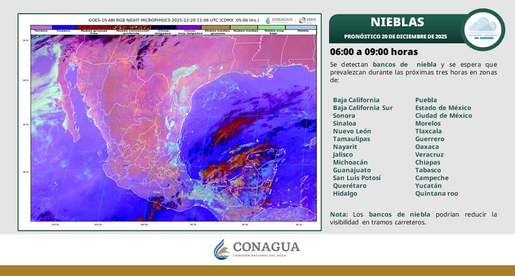 Durante las primeras horas del día, también se han detectado bancos de niebla en distintos puntos de la Península de Yucatán, condición que podría reducir la visibilidad en tramos carreteros, por lo que se recomienda extremar precauciones al conducir.