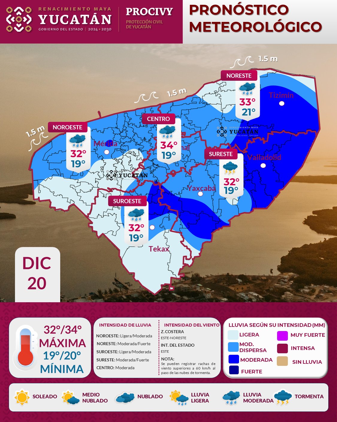 De acuerdo con los sistemas meteorológicos actuales, después de las 14:00 horas se esperan lluvias moderadas y localmente fuertes en municipios del noreste y sureste de Yucatán, mientras que en el centro, suroeste y noroeste del estado, incluido el municipio de Mérida, las precipitaciones serán de intensidad ligera a moderada.
