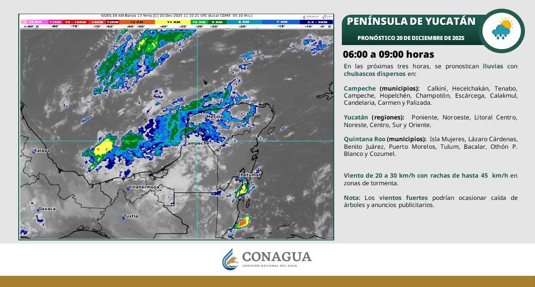 En Quintana Roo, el pronóstico indica lluvias con chubascos dispersos en municipios como Isla Mujeres, Benito Juárez, Puerto Morelos, Tulum, Bacalar, Othón P. Blanco y Cozumel, derivadas de la interacción del frente con canales de baja presión y el ingreso de humedad desde el mar Caribe.
