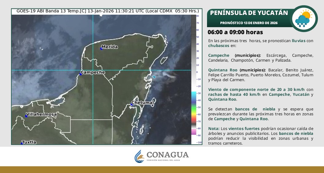 En el estado de Yucatán, los efectos del frente estacionario se traducen en lluvias dispersas de intensidad ligera a moderada, las cuales se presentan antes del mediodía en el norte y noroeste y por la tarde en el sur. El ambiente será templado a cálido, con temperaturas máximas entre 27 y 32 °C en el interior y de 24 a 26 °C en la zona costera. Para la madrugada del miércoles 14 de enero se esperan mínimas frías, especialmente en Tekax, Peto, Oxkutzcab, Yaxcabá, Chikindzonot y Chankom.