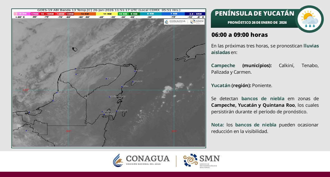 El frente frío número 30, denominado “Pop Ox”, ingresó este lunes 26 de enero a la Península de Yucatán desde el mediodía, provocando un cambio significativo en las condiciones del tiempo en el estado. El sistema viene acompañado de lluvias, un evento de “norte” fuerte y un nuevo descenso marcado de temperaturas, impulsado por una masa de aire frío de origen ártico.