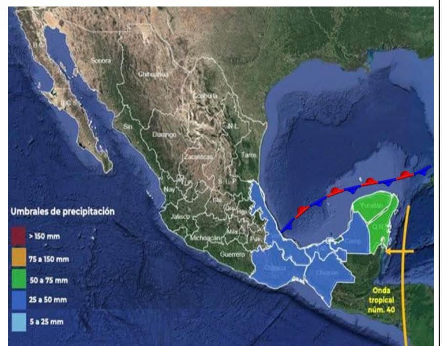 CANCÚN, Q. Roo, 4 de noviembre de 2025.- El Frente Frío No. 12 continúa estacionario sobre la porción norte de la Península de Yucatán y mantiene interacción directa con la Onda Tropical No. 40, ubicada frente a las costas de Quintana Roo, de acuerdo con el más reciente reporte del Servicio Meteorológico Nacional (SMN) y la Comisión Nacional del Agua (CONAGUA).