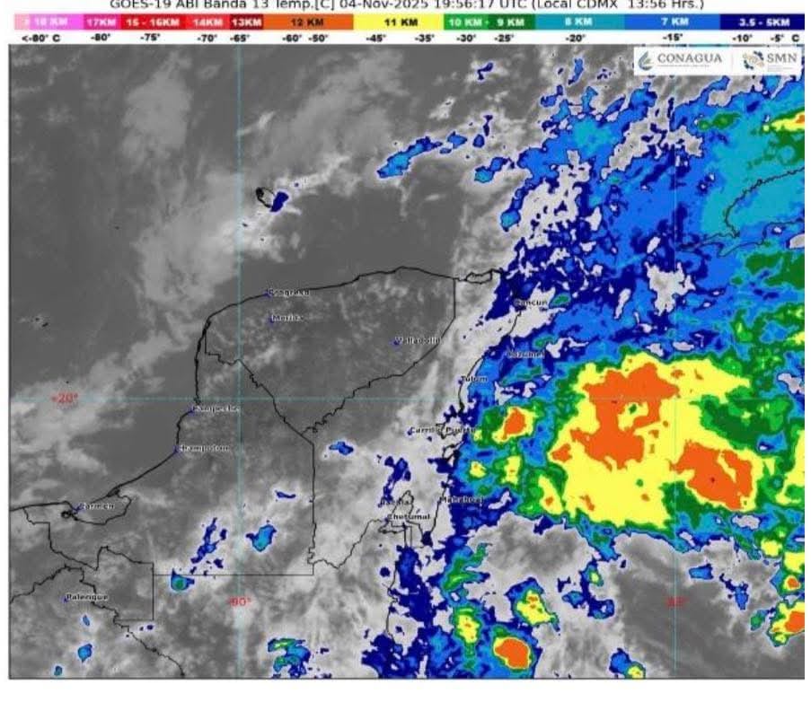 Las imágenes satelitales de la CONAGUA muestran un extenso sistema nuboso con núcleos de tormenta sobre el Mar Caribe y el litoral de Quintana Roo. De acuerdo con el análisis del SMN, la interacción entre ambos sistemas provoca un canal de baja presión que favorece el ingreso de humedad, lo que refuerza las precipitaciones en toda la región peninsular.