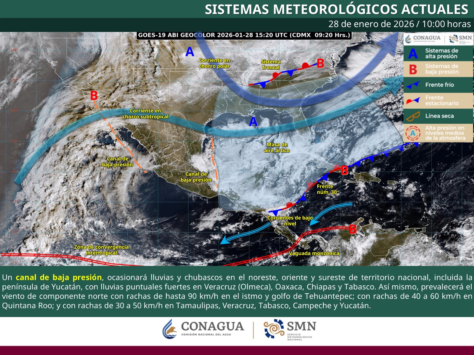 Mérida, Yuc., a 28 de enero de 2026. — La masa de aire ártico que impulsó al frente frío número 30 comienza a modificar sus características térmicas; sin embargo, mantiene un ambiente frío a muy frío con posibles heladas en las regiones montañosas del centro y oriente de México, y genera bancos de niebla que podrían reducir la visibilidad en carreteras. A la par, un canal de baja presión sobre el occidente del golfo de México y el ingreso de humedad del océano Pacífico favorecen lluvias y chubascos en el oriente, sureste y península de Yucatán, así como vientos fuertes en las zonas costeras del golfo.