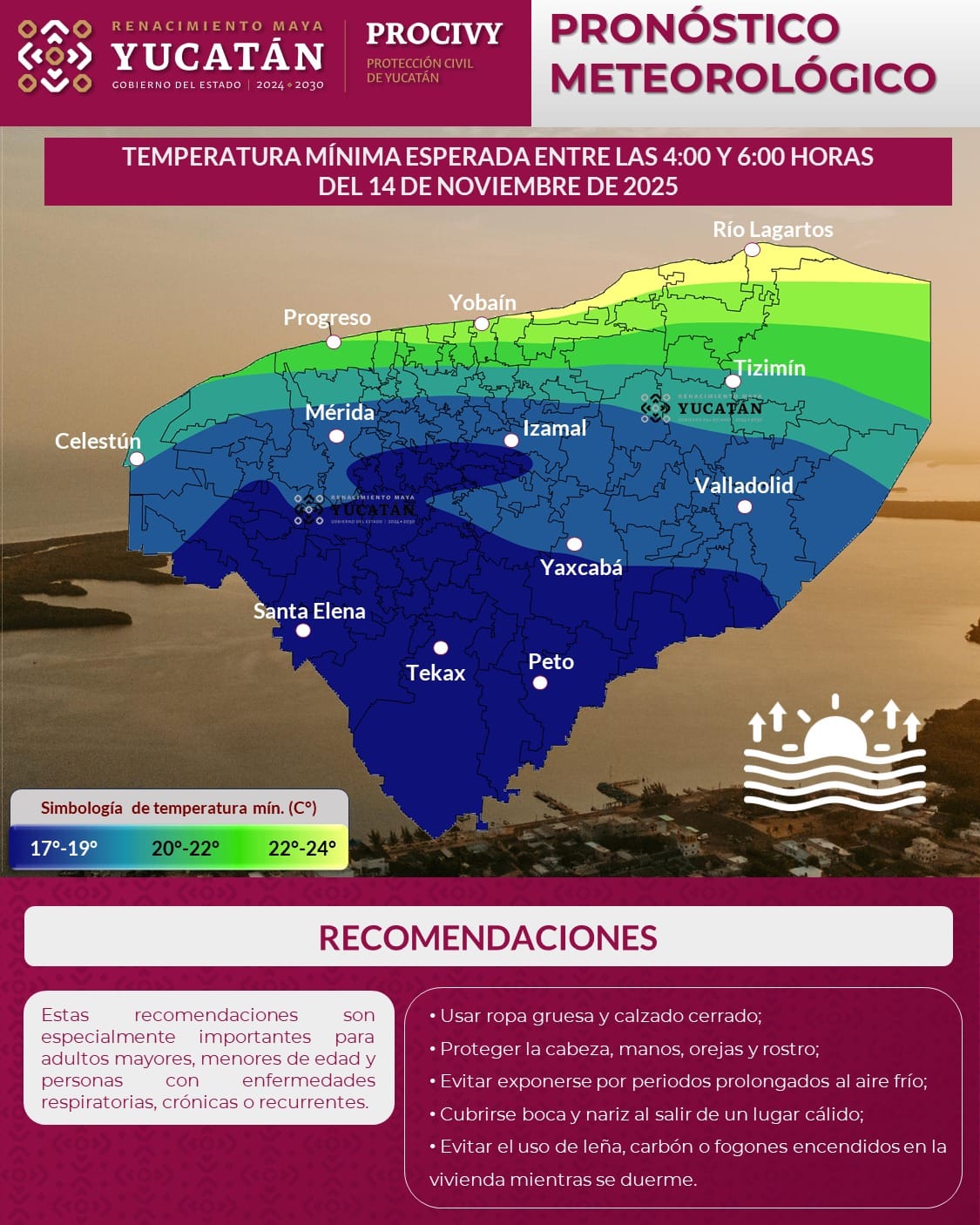 La Comisión de Protección Civil de Yucatán (PROCIVY) informó que este viernes 14 de noviembre continuará el ambiente fresco en gran parte del estado, especialmente en las regiones centro y sur, donde se prevén temperaturas mínimas que oscilarán entre 17°C y 19°C. De acuerdo con el pronóstico, las zonas rurales serán las que registren las condiciones más frías al amanecer.