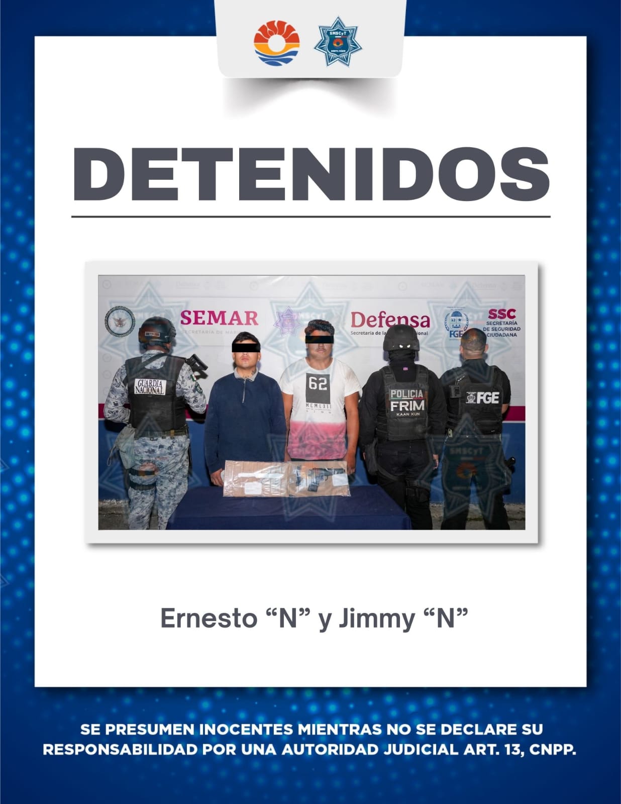 Cancún, 13 de febrero. – La coordinación entre la Guardia Nacional, la Fiscalía General del Estado y la Policía Cancún, como parte del operativo Blindaje Cancún, permitió la detención de dos hombres presuntamente implicados en el robo de un vehículo tipo taxi en este destino turístico.