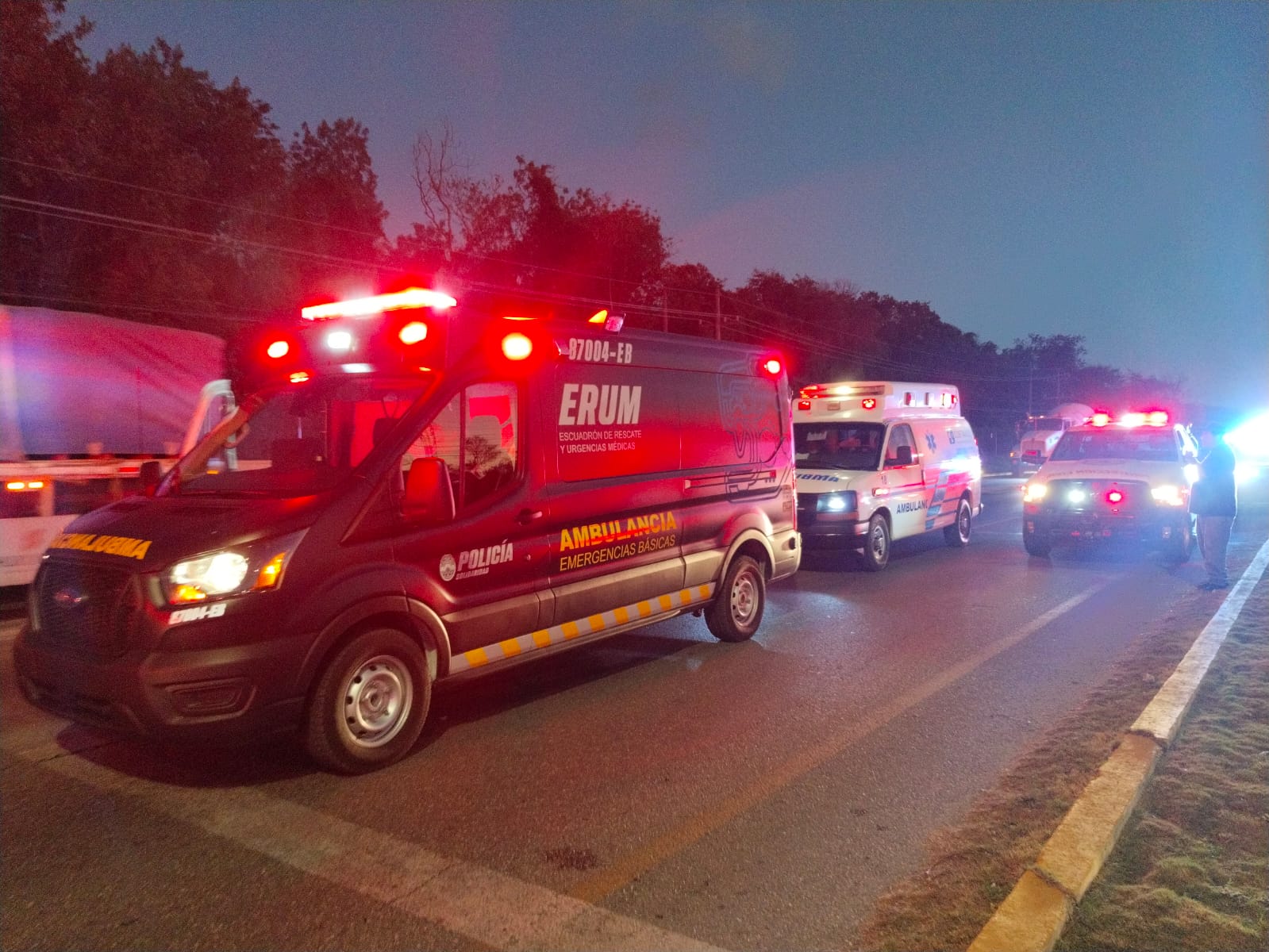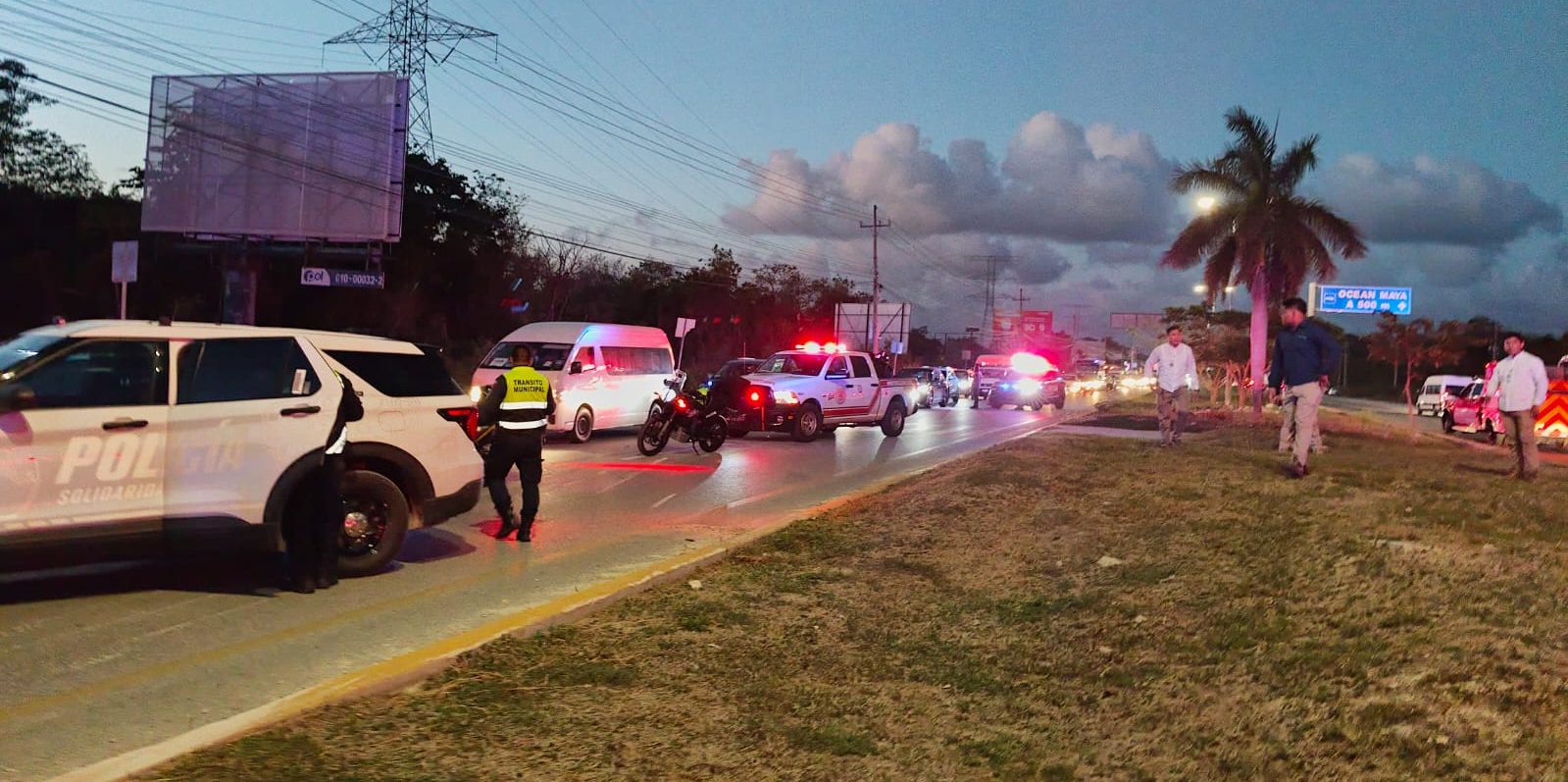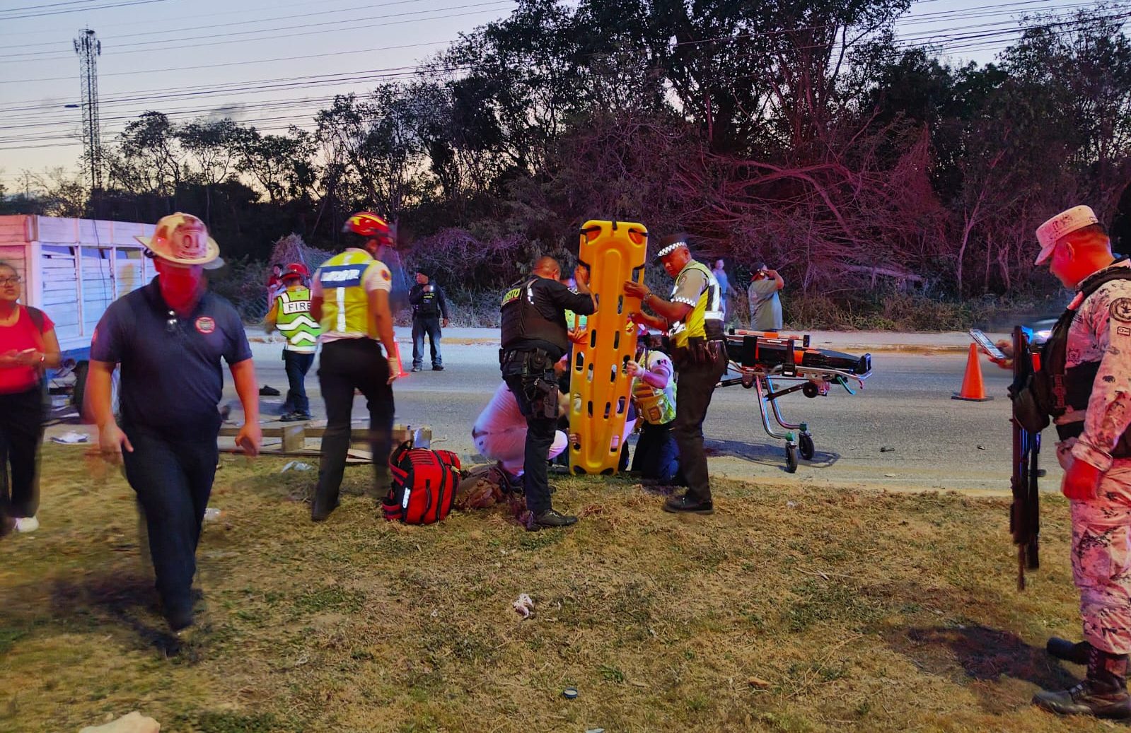 Playa del Carmen, a 16 de mayo.– En una rápida y coordinada respuesta, elementos de la Secretaría de Protección Civil, Prevención de Riesgos y Bomberos, en conjunto con la Secretaría de Seguridad Ciudadana Municipal y con apoyo de la Guardia Nacional, atendieron un fuerte accidente vehicular registrado sobre la carretera federal 307, en el tramo Cancún–Playa del Carmen, antes del ingreso a la cabecera municipal en la tarde noche de este viernes.