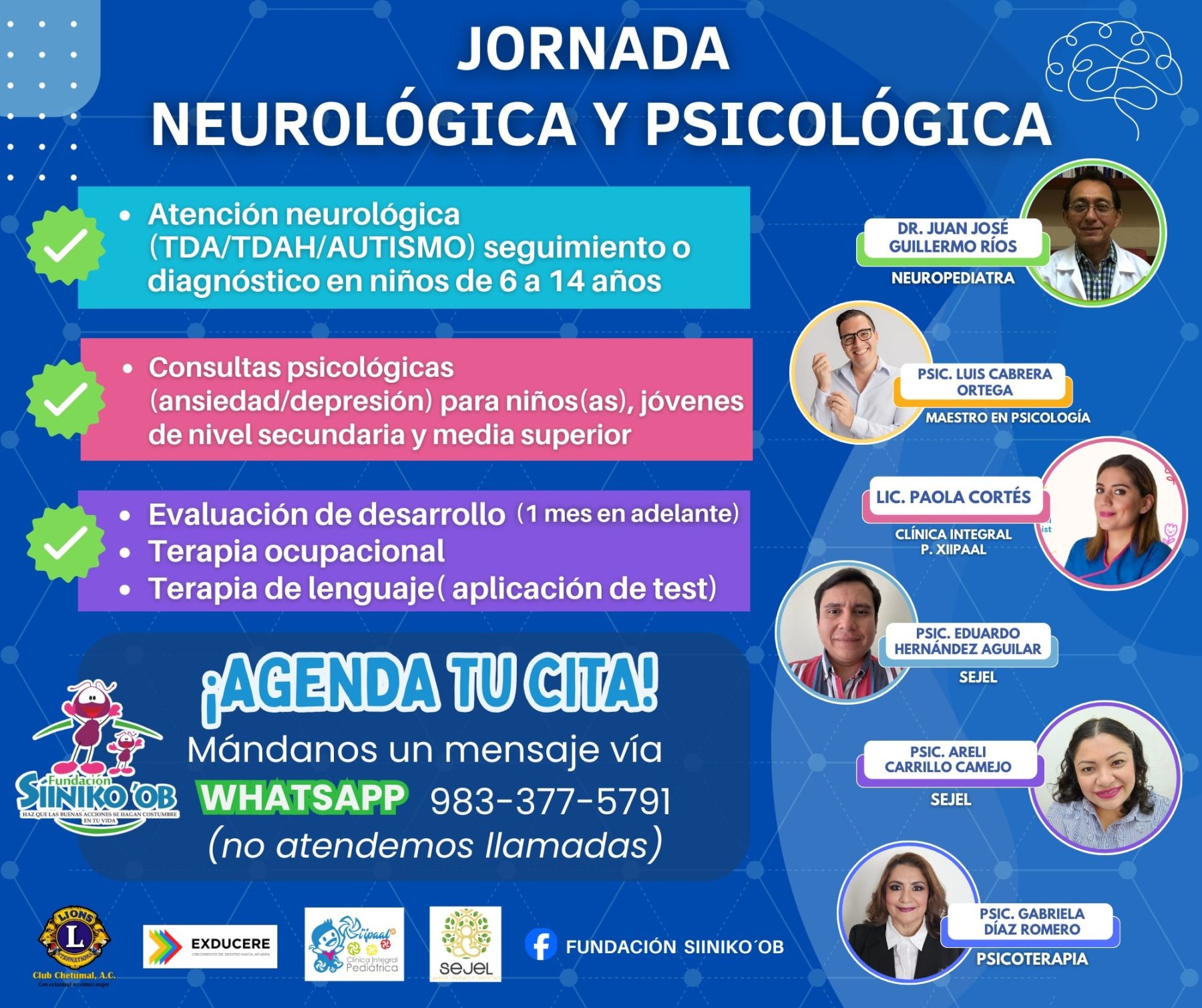 La jornada forma parte del trabajo social que Fundación Siiniko’ob ha impulsado en los últimos años, articulando esfuerzos con el Centro SEJEL, Clínica Integral P. Xiipa’al, Fundación Pediátrica del Caribe, Fundación Exducere, Club de Leones Chetumal A.C., además de profesionales independientes como el neuropediatra Dr. Juan José Guillermo Ríos y el psicólogo Luis Cabrera Ortega, la Terapeuta Ocupacional Paola Cortés, entre otros reconocidos profesionales.