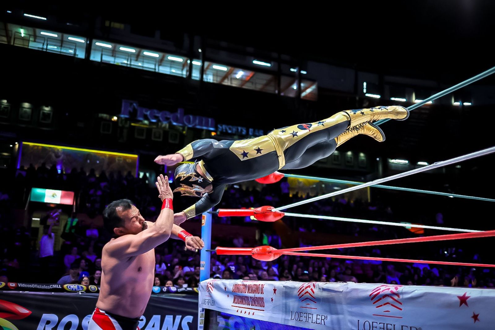 Durante la batalla vespertina del domingo anterior, el luchador quintanarroense hizo gala de su agilidad acrobática, deleitando a los asistentes con varios vuelos mortales, como uno que realizó desde la tercera cuerda y de espaldas al graderío, sobre la humanidad de Mercurio.
