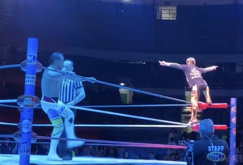 De igual manera el -Mini- luchador y orgullo de Chetumal, ejecutó un entre la segunda y tercera cuerda, saliendo del cuadrilátero y andando al suelo al Pequeño Olímpico, provocando la algarabía de los asistentes a los -Domingos Familiares- de la “Arena México”.