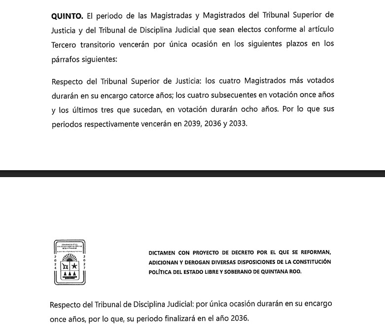 No obstante, la regla establecida por la reforma constitucional indica que sólo 4 deben durar ese tiempo, mientras que los siguientes cuatro deben durar 11 años, y el restante magistrado electo, 8 años, situación que el Ieqroo no ha indicado cómo va a resolver al existir 7 con igual número de votos, embrollo causado por la alteración del sistema original de votación para marca una lista completa.