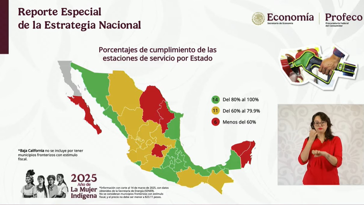 En ese informe explicó que el 27 de febrero, el día siguiente que se firmó la estrategia nacional, únicamente el 25.2 % de las estaciones de servicio vendía la gasolina en menos de 24 pesos, mientras que el 14 de marzo, ya el 68.8 % de las estaciones de servicio ya cumplía con esta disposición en el promedio nacional.