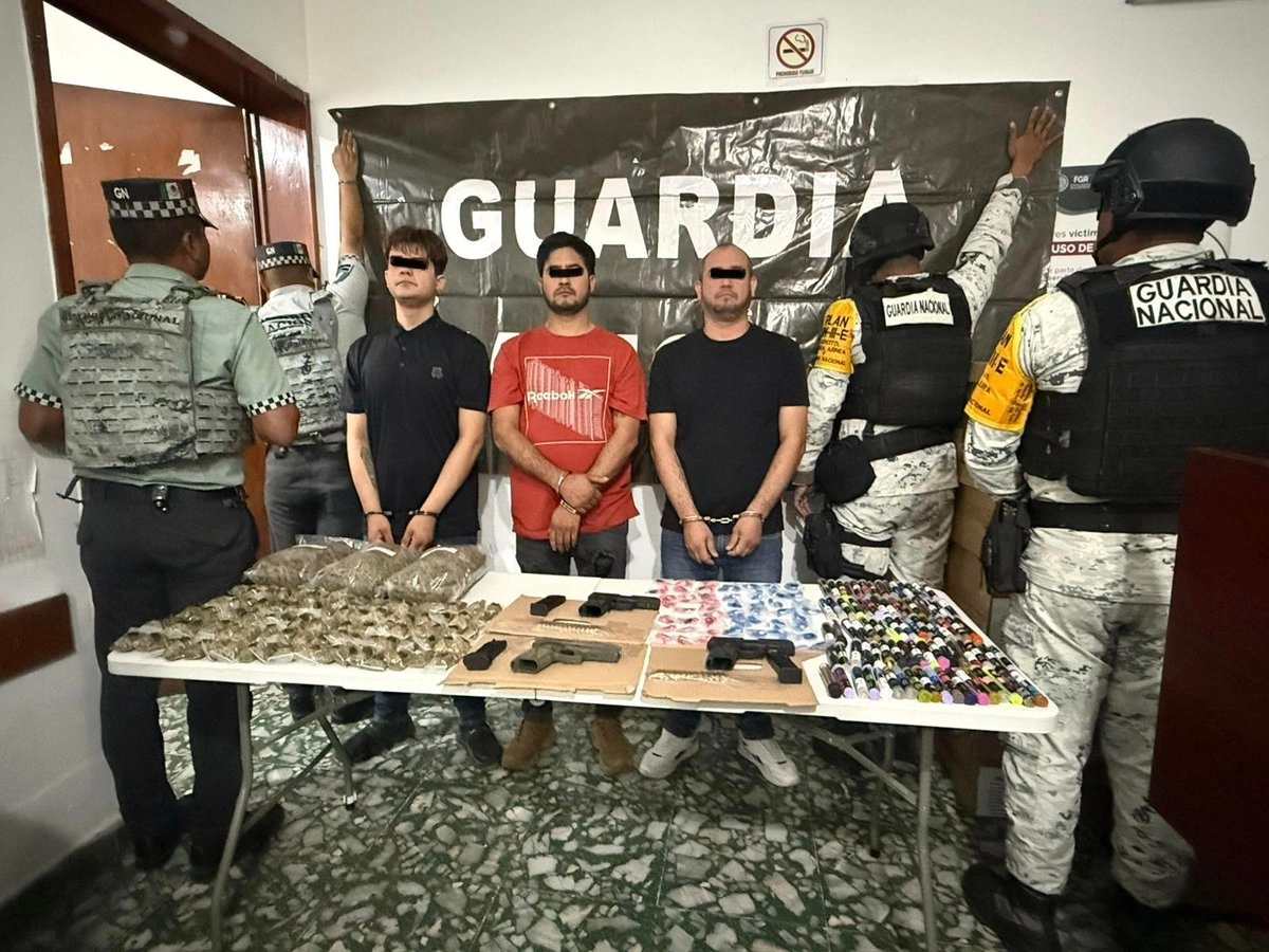 Al hacerles una revisión, las fuerzas de seguridad militares les aseguraron tres armas cortas tipo escuadra, dinero en efectivo y casi dos mil dosis de narcóticos entre mariguana y presunta cocaína.